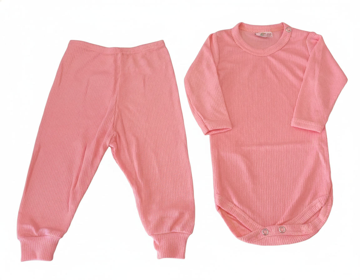 O kit é composto por um body de manga longa com fechamento por botões de pressão no ombro e entrepernas, facilitando significativamente as trocas de fralda. A calça coordenada possui elástico confortável na cintura e punhos, oferecendo um caimento perfeito. É a escolha ideal para manter as pequenas aquecidas com estilo e aconchego.