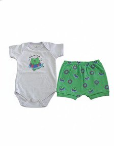 Acompanha body branco de manga curta com estampa divertida de sapinho e short verde com elástico na cintura e estampa combinando. Uma opção leve e confortável para o dia a dia, passeios e momentos de lazer.